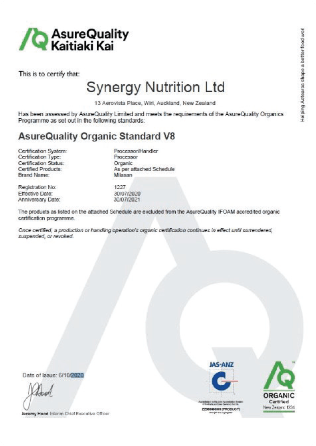 Chứng nhận uy tín từ New Zealand, đảm bảo sản phẩm được sản xuất hoàn toàn theo quy trình hữu cơ nghiêm ngặt, không sử dụng hóa chất tổng hợp, thuốc trừ sâu, hay hormone tăng trưởng. Điều này đảm bảo sản phẩm an toàn, tự nhiên, và đạt tiêu chuẩn cao về chất lượng và an toàn cho sức khỏe.