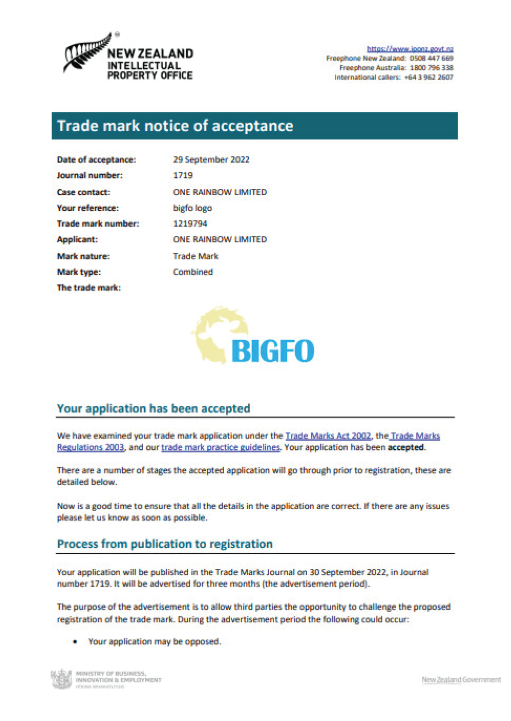 Giấy chứng nhận "Trade Mark Notice of Acceptance" từ Cục Sở hữu Trí tuệ New Zealand xác nhận thương hiệu đã được đăng ký, bảo vệ quyền sở hữu độc quyền và ngăn chặn sử dụng trái phép, đảm bảo quyền lợi thương mại và niềm tin cho người tiêu dùng.